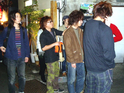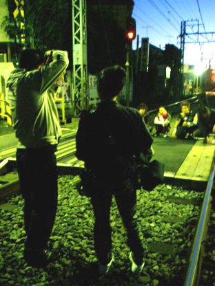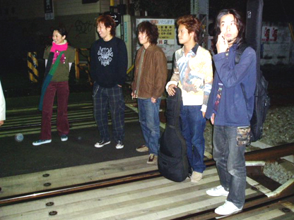 朝5時すぎ、空が白んできたので、いよいよ外へ!まずは鉄道会社の工事のオジサンの立会いの元、踏みきりに入って撮影開始。今回の設定は<徹夜のバンド練習明けに街をうろついている4人>です。
