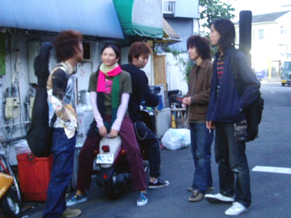 最後の撮影は、道端に停めてあったバイクに乗ったり、立ち話している感じで。短い<夜明け>の時間帯に急いで盛りだくさんのカットを撮った今回の撮影もこれにて無事終了!最後に小島さんと記念撮影するTHE BACK HORNの面々。