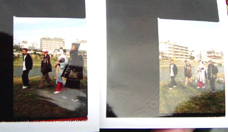 鴨川ほとりを歩きながら談笑する10-FEETの面々&菊乃さん。気さくな10-FEETの3人のキャラもあり、和むのもはやいっ。<舞妓さん>という未知の職業に興味津々で質問してました。そんな様子をカメラマン平間さんが撮影。出来あがったポラはこんな感じ。