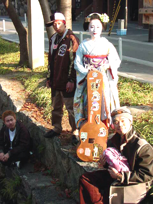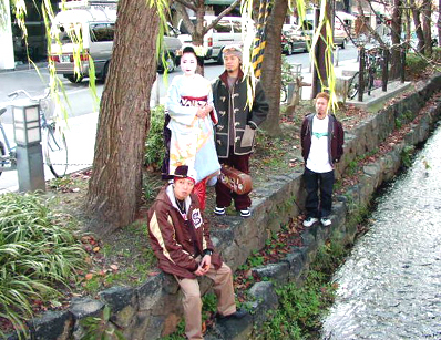 撮影は橋の上から。TAKUMAさんのギターケースと菊乃さんが持ち歩くバッグという小道具交換をしたり、場所を変えて柳の下に立ってもらって2パターンを撮影。