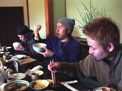 撮影後にそば屋<権太呂>で昼食タイム。「京都で撮影めっちゃうれしかったですわ~。」とリラックスしてどんぶりを食べる10-FEETの面々。話題はやっぱり昔からの友達や家族や地元のことに。ちなみに写真のTAKUMAさん、エビに驚きすぎです(笑)!最後までサービス精神旺盛の10-FEETなのでした。みなさま、おつかれさまでした!