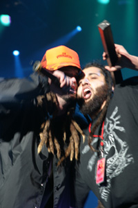 ラウド界の不完全種バンド、コーンの最新作『Take A Look In The Mirror』は、ファースト時の初歩原理に立ち返り、野獣覚醒の牙を突きつけた傑作だった。約5年ぶりの来日、再び戦闘モードに突入したその瞬間を見届けたい、と思う人は大勢いたに違いない。1曲目“Right Now”から観客の興奮は頂点へと駆け上がる。とてつもない重低音の振動が体に伝わり、彼らを眼前にした実感が沸き起こる。MCもなく、次々と繰り広げられる漆黒の世界はさすがとしか言いようがない。最新作からは4曲のみに止まり、“Blind”や“A.D.I.D.A.S.”などの代表曲を挟み、本編最後の“Kill You”ではジョナサンの押し殺すような叫びが会場に響き渡った。アンコール2曲、ラストは紙吹雪が舞い、ジョナサンは笑顔で観客に応えた。やはり、貫禄の凄みがある。だが、さらに欲を言えば、煮えたぎる感情の底辺まで触れたかったという思いも残るライヴだった。(この項のみ荒金良介)