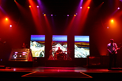 中盤からは、ステージのバックにパネル・スクリーンが登場。そこには、アルバム・ジャケットに映る鳥人間(?)の影や、空撮の風景画像、マシューのピアノの指使いのアップなど、楽曲にあわせた映像が映りこみ、会場の空気を盛り上げていく。中でも、特に目を奪われたのが、3人の音に合わせて演奏するオーケストラの姿だ。『ABUSOLUTION』でのライヴで、筆者が最も気になっていたオーケストラ・パートの再現を、サーモグラフでのオーケストラ映像を使うことで、臨場感以上の高揚を煽られた気がした。
