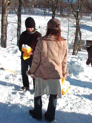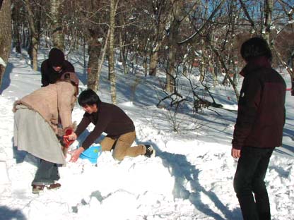 撮影の合間、思い思いに雪遊びを始めるSUPERCARのみなさん。バケツで雪をプリンの形に並べたり、壊したり。公大さんは雪まみれ。タワレコタオルで雪を持つボーカル・ナカコーこと中村弘ニさんとベース・ミキさん。そこにギター・淳治さんの投げた雪玉が飛んできて不思議なことになってます。SUPERCARスタッフ曰く「いいグルーヴが生まれた」とか。