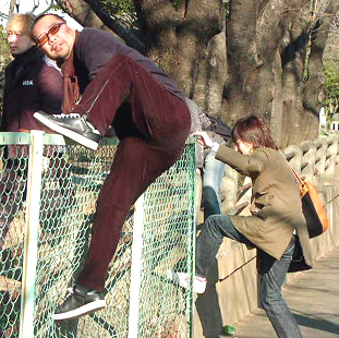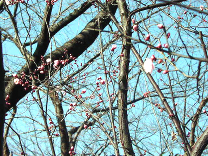 まずはスタッフがロケハンへ。箭内さんの案内で、フェンスを乗り越えるカメラマン・平間さん。フェンスを超える時もカメラ目線のサービス(笑)。到着した場所には…なんと早咲きの桜が!!まだ2月だというのにしっかり花開き始めていました!