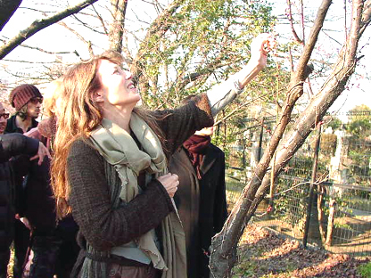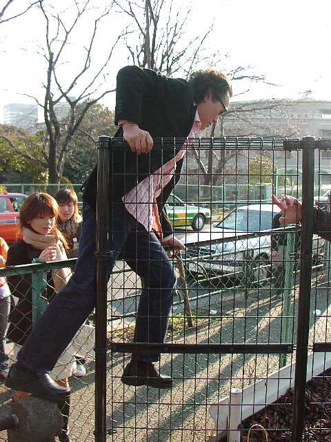 さっそく撮影場所ヘ。陽水さんもワイルドに柵を超える!ジェーンさんは桜の木の前での撮影がうれしそう。
