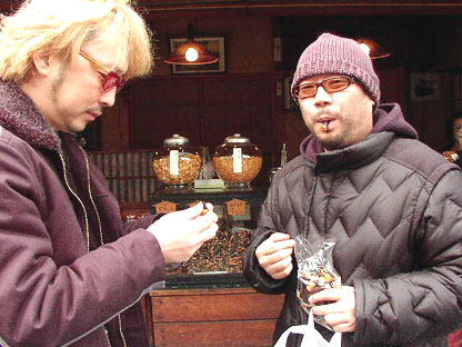 今回は都内にあるせんべい屋<菊見煎餅総本店>に集合。並んでいるせんべいがあまりに美味しそうで、待機中に買い食いするスタッフ!海苔巻をくわえてポーズをとるカメラマン・平間さんと味見するディレクター・箭内さん。