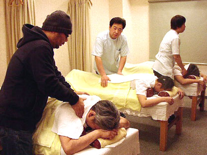 <マッサージ治療院>へ移動。顔が見えませんが、奥から坂本さん、高橋さん、細野さんです!なぜか手前では平間さんがマッサージを…。マッサージ通だけあって、細野さんもマッサージの先生も認める上手さ!撮影が始めると、リラックスしすぎて「目がトローンとなっちゃうんですけど…」と高橋さん。その<素>のままを撮影いたします!