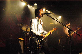 そんなこんなで、ねっとりとしたギターの調べ──サンタナのナンバーをSEに椿屋四重奏の3人が登場。黄色い歓声が飛ぶ。下北沢で初ワンマンというレヴェルのバンドのお客さんは、あたりまえのように耳の早い女子ファンが多いのですが、いわゆる下北沢界隈をベースにするギター・バンドのお客さんとくらべて、ちょっぴり小綺麗な娘さんたちが目につくような気も……と、それはともかく、1曲目は最新アルバム『深紅なる肖像』同様“ぬけがら”から。丁寧に爪弾かれるギターの一音一音に、会場には水を打ったような静けさが。そして、その静寂を切り裂くかのように、“終列車”の重たいリフ、続いての“成れの果て”というアルバム同様の流れで、お客さんのテンションはググーッと上がる。なんかこう、彼らの堂々たる佇まいやドラマティックでスケールのデカい音、そこから放たれる目に見えない空気みたいなものが、もはやキャパ300人そこそこの同会場では窮屈過ぎるぐらいの質量で迫ってきます。なもんだから、初ワンマン初日のステージが始まったばかりだというのに「これはSHIBUYA-AXで観たいもんだな」などとブツブツ考えてみたり……。