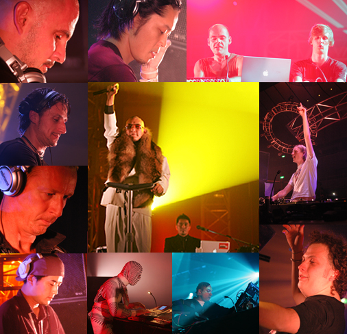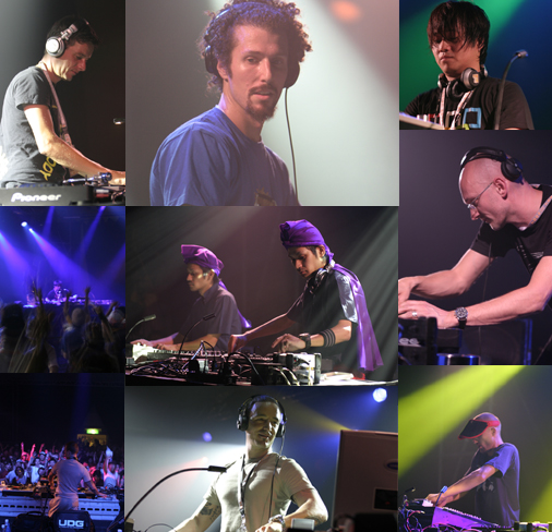 この日、まずド肝を抜かれたのは初登場のミシェル・デ・ヘイ。オランダでトップDJの座に君主するだけあり、そのテクニックは伊達じゃない!アムス特有のもっさりとしたハウスを主体に、ブレイクを多用しつつも決してアゲ過ぎずオトし過ぎず、ツボを突いた選曲でクラウドを早くもピークタイムばりのテンションにまで持ち上げ、力量を見せつけた。そのセクシーな風貌やスタイルはロラン・ガルニエに通じる所もあるかも・・・なんて思ってるうちに今夜の目玉、電気グルーヴのライヴに突入。スクリーンには電気が過去出演したTV番組で〈電気グルーヴの皆さんです〉と紹介される場面をリミックスしたものが映し出され、3年間のブランクを全く感じさせないいつもの調子に早くもニンマリ。そして“ドリルキング社歌”をオープニングに、セグウェイ(!)に乗ったスキンヘッドのピエール瀧と卓前に立つ石野卓球の姿が目の前に現れた!“ガリガリ君”、“誰だ!”、“スマイルレススマイル”、”虹”、“電気ビリビリ”、“富士山”の全6曲、初期~中期の名曲をよりマッドにアレンジした怒濤の展開に、会場は一曲ごとに大きなどよめきを上げながら騒ぎまくるお祭りトランス状態に。