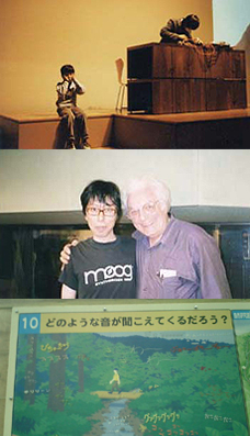山本ムーグさんより届いた近況写真×3。「DJ大人と子供」、「本物のムーグ博士と」、「どのような音が聞こえてくる?」