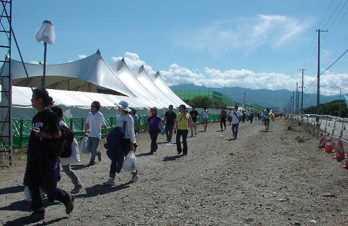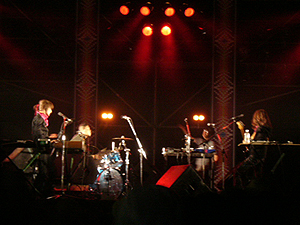 2年前のRISING SUN出演時は、機材トラブルにより演奏を中断。今年はその雪辱戦の意味も込められたライヴになるだろうと予測していたのだが、ゆらゆら帝国はやはりいつもどおり。まるで観客なんていないかのようなマイペースっぷりでライヴをスタートした。演奏のほうは、彼らが取ってきた〈淡々と狂っている〉態度を崩さず、ラストまでじわじわと狂度を増すというセッティング。初期傑作“グレープフルーツちょうだい”からラストの“貫通”で3人が3様のノイズを撒き散らすまで、およそ北海道の自然に似つかわしくないどろどろのディープな演奏を響かせていた。最近のゆらゆら帝国を見ていると、ちょっと不安になることがあった。彼らが持っている〈予定調和から逃れるための逸脱〉が、いずれは予定調和になって、そこからまた逃れるために逸脱して……、という無限ループにはまっているように見えなくもなかったからだ。が、やはり彼らは自分たちの立ち位置なんてどうでもいいのだろう。ただ〈淡々と狂っている〉だけなのだ。