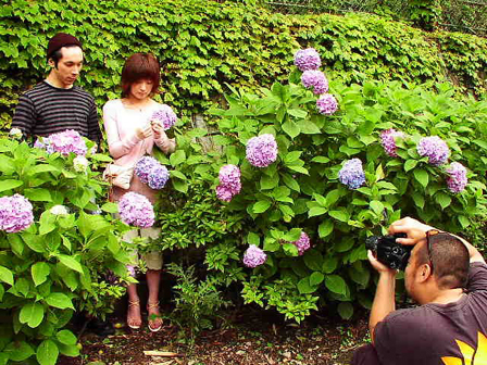路に咲くあじさいの中で撮影。林檎さんの頭にあじさいの花をつけてあげる首藤さん。なんだかカワイイお二人です。