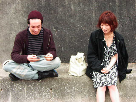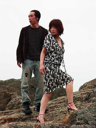 日暮れに海へ。波打ち際を歩き、岩場に登るシーンを撮影。「微妙な格好じゃないですか??」と言いながら振り向く林檎さん。座って休憩する二人も絵になるので、またもや平間さんが急遽撮影!