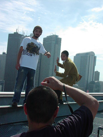 カンフーをしているかのようですが…(笑)。実は中田さんとDRAGONさんが高層ビルを押したり抱えているように見える構図で平間さんが撮影中。