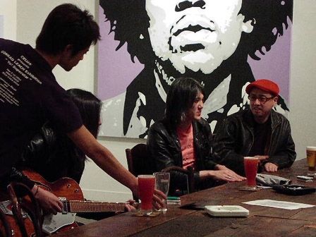 ROSSOの皆さんが揃って飲んでいた赤いお酒が「ROSSOっぽい」というディレクター箭内さんの一言で、撮影の小道具に決定。お代わりが運ばれてきたところで、いよいよ撮影開始!