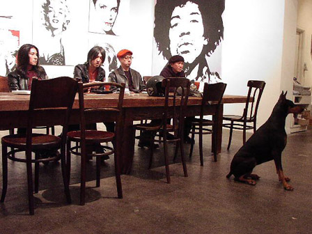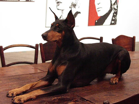 ここでドーベルマンの「ベニ」が登場。毛並みが美しい、とても穏やかな性格の犬です。それにしてもROSSOとドーベルマン…似合います!別カットも撮影。