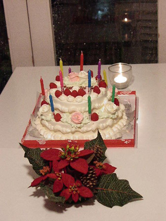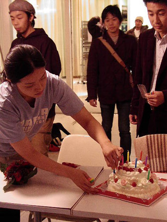 その頃、急遽決定した室内での<クリスマスパーティー>撮影のため、スタッフが買出しに走ってクリスマスケーキを準備中。デコレーションはカフェの店員さんにお願いしました。プロの鮮やかな手つきに一同感動!普通のケーキがあっという間にクリスマスケーキに!