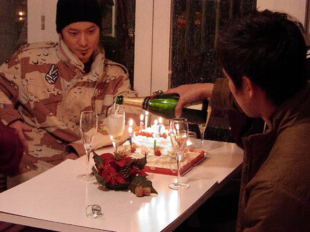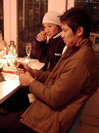 シャンペンを開けるMIYAGAMIさん。上手に開けすぎてコルク栓が飛ばないハプニングも(笑)?いざ乾杯!!照明が落とされ、キャンドルの灯の中で言葉少なくグラスを合わせる4人。渋い!