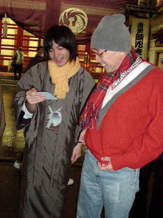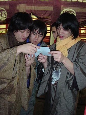 撮影が終わって着物を脱いだテリーさんとポラチェックする銀杏BOYZの皆さん。