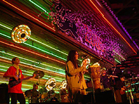さて、我らが目的地〈ユニバース〉に入って、まず目に飛び込んでくるのは、大惑星と小惑星をイメージしたキッチュ&ゴージャスな電飾やシャンデリア。赤・緑・黄のライトがチカチカと点滅するステージ(70年代のパチンコ屋風?)。祭りムードを盛り上げる、きな粉餅や年越しそばの屋台。そして、フロアを行き交う人・人・人……!