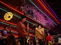 ジャンルも世代も関係なく、ホンマにおもしろくて凄いものにはストレートに反応する。これぞ大阪の懐の広さ! そして2004年も残すところ30分。いよいよトリのエゴラッピンの登場。個人的には、新作『merry merry』が、80'sニューウェイヴ志向の作品だっただけに、なんで今さらキャバレー? とも思っていたのだが、いざ幕を開ければ、そんな愚問はふっ飛ぶ唯一無比のエゴワールド。“フジヤマ・ママ”のカバーも、ユニバースというエキゾ空間と、エゴ開始前のDJ=元Determinations 高津氏による日本のツイストなどを中心とする選曲の流れもあって、ツボハマリ。ステージを走り回って、観客を煽りまくるヨッちゃん。あくまで飄々と、たまらんフレーズを繰り出してくる森くん。そして、エゴのライヴを支えるおなじみのバンドメンバー。