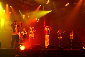 出ました、今回ぼくが一番楽しみにしていたゴールディー・ルッキン・チェイン、これはアリだ。垂れ幕に書かれた通り、83年からやっているというオッサンたちの無法集団が鳴らすヒップホップへの愛。売れなくても20年間頑張ったというこの方法論は日本でもやれるんじゃないだろうか? EXILEがこれかもしれないが、GLCのようにダサくやるほうがかっこいいな。客が英語がわからないからとMCで「次の曲は初登場1位になったんだぞ」とか嘘八百言っていたのもバカっぽくってよかった。83年からやっているというのも大嘘。でも83年というのはイギリスのヒップホップ・シーンの建国記念みたいな重要な年なので、そういうのよくわかっているのもかっこいい。本当に1位になった曲はYMOの大ネタ使いでもっと笑えた。