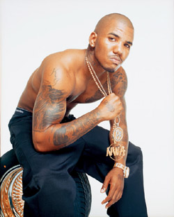 また体の方も、クラスに1人は居たバスケ部のがたいがいい奴(無口だけど、なにげにサボるのがうまい)といった感じで、50と比べてかなりマイルド。特にお腹あたりの肉のノリっぷりがいい味出しており、ボディビルでガチガチに鍛えた体よりもストリート寄りな感じで喧嘩とか強そうなイメージだ。さらに大胸筋と右腕に「N.W.A」のロゴと故イージーE (N.W.Aのリーダー)のタトゥーが刻まれているところにも注目。彼等の世代感覚としては同じコンプトン出身の N.W.A はもはや完全な伝説なのだ。