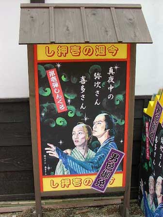 <たわあ麗溝堂>を発見!!のぼりが立ち、店頭には長瀬智也さん&中村七之助さん演じる弥次喜多のCDならぬソノシートを宣伝する「今週の壱押し」看板が。江戸時代だけにCDではなくソノシートを販売してたという設定。ソノシートとは透けたペラペラのアナログのような昔懐かしいメディアのこと。凝ったセットにタワレコスタッフ一同感動!