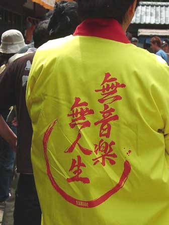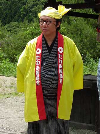 店長役のしりあがりさん。着物の背中には「無音楽無人生」が!今回の配役はほぼ宮藤さんの第一希望で決まったとか。しりあがりさんは「たわあ麗溝堂店長役は楽しかった!」と後日談でも語るほどハマリ役!