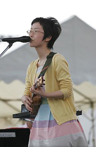 〈TAGAJO(多賀城)〉、〈HATAHATA(鰰)〉、〈TUGARU(津軽)〉、〈ARAHABAKI(荒吐)〉と、東北地方にゆかりのある地名や名産などの名前が付けられているステージを見ながら会場をぶらぶらしている間に雲は上がり、太陽が顔を見せた頃、ステージ〈HATAHATA〉に、トップバッター〈秋田民謡の歌い手〉、藤原美幸が登場。なんの説明もなく「秋田名物八森ハダハダ~」と“秋田音頭”のフレーズが出てきたことにかなり戸惑ってしまったが、ステージに集まった若者たちはおかまいなしにハンドクラップ(!)でバックアップしている。なんともモンドな光景と、それを作り出した若者のテンションに関心しつつ、〈TAGAJO〉ステージに移動するとつじあやのがスタート。ジブリ映画「猫の恩返し」主題歌“風になる”、“桜の木の下”、“クローバー ”、“春風”と続く、まさしく〈春〉な選曲に、寝転がりながら聴いている観客もあちらこちらに散見された。客席にはそんなほのぼのムードが漂っていたものの、バンドの演奏はかなりタイト。ベース、ドラム、チェロ、キーボードという変則編成ながら、リズム隊の安定感は抜群、上モノのバランスもかなり練られているように感じた。「ウクレレの人でしょ?」なんて軽く思っていた人はいい意味で裏切られたはず。