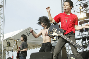 再び〈TAGAJO〉ステージに戻り、続くスカパラへ。短いセットながら、アップもスロウもこなす緩急のついた選曲で観客を踊らせまくり。活動10周年を超え、なおルードっぷりに磨きがかかったステージはまさしく圧巻。「ぐずぐずしてるとすぐ終わっちまう。本気で盛り上がれ」というMCのとおり、会場が霞んで見えるほど砂埃のスモークが立ち上がっていました。〈TUGARU〉ステージに戻ると、PAチェックの段階から峯田がステージ上で弾き語りを披露していた。一度引っ込み、上半身裸になって再度登場する頃には、観客の〈1mmでも峯田に近づきたい〉という欲求はピークに。弾き語りでもおかまいなしのモッシュ&クラウドサーフが起こり、よだれを垂らしながら歌う峯田のパフォーマンスはどんどん過剰になっていく(最後はドラムセットにダイブ!)。銀杏BOYZのライヴに何度か足を運んだ人ならわかると思うのだが、彼らのライヴは無茶苦茶なように見えて〈お約束〉が多い。それでもリピーターは数多くいるし、そのリピーターはむしろ〈お約束〉を求めているように見える。恐らく本人たちはそこになんらかの矛盾やジレンマを感じているとは思うのだが……。なんにせよ、観客の熱狂と、なにをやらかすかわからないバンドに対する裏方スタッフの迷惑そうな顔の温度差が傍目には面白くてしょうがなかった。