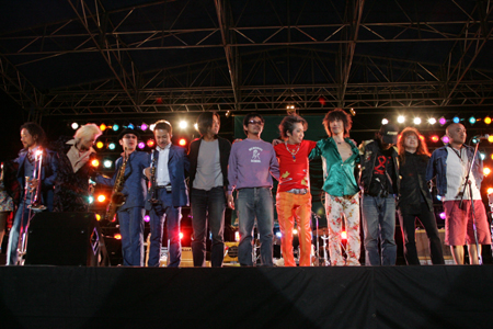 肌寒さは完全に〈寒さ〉となり、重ね着をしなければとても耐えられない温度に。そんな気温を忘れさせるほどのエンターテイメントフルなステージを見せてくれたのが大トリの忌野清志郎&NICE MIDLE with NEW BLUE DAY HORNSだった。デビュー35周年を迎えた御大は、ホーン3本を随えた7人編成のバック・バンド、さらに司会とマント持ち(!)を抱えたジェームス・ブラウン・スタイル。新作『GOD』からの曲と、現在のスタイルにアップデートされた“トランジスタ・ラジオ”、“宝くじは買わない”(デビュー作!)などのヒット曲を織り交ぜた構成に、客席全体からアドレナリンが出まくりの状態に。さらに、隣の会場で行われていたTHE HIGH-LOWSのライヴ終了直後の甲本ヒロトが駆けつけ、『GOD』収録の“JUMP”と、RCサクセションの“キモちE”を熱唱。興奮を焚きつけるようなセット・リストと、数回のマント・ショー(布団ショーもあった)、潔いくらいわかりやすいコール&レスポンス。R&Bへの敬虔とロックへの愛情、そしてなにより35年間のキャリアが持つ説得力を見せ付けられてしまった。……と、さも終わりのように書いたが、アンコールではスカパラホーンズと奥田民生がゲストに加わり“上を向いて歩こう”のソウル・カヴァーを、さらに高野寛と宮藤官九郎が参加し、総勢14人で“雨上がりの夜空に”を歌うという、さらなるサプライズが用意されていた。会場にいた全員が文句なんて付けようもないほどの豪華なステージで本編は終了。とんでもないものを見せられてしまいました。