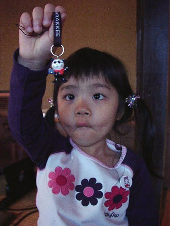 撮影に使われたのは、都内の有名串揚げ屋。昔ながらの店構えがいい感じ。登場した荒木さんは、最初からテンション高い!写真家らしく「シケてるなぁ!」と曇天での撮影を気にした後、「今日プレゼント持ってきた。“ニャラーキー”!携帯につけなさい。」とミーナちゃんに携帯ストラップをプレゼント。ミーナちゃんの口も
