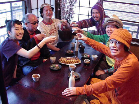 今回の撮影では串揚げではなくて、春らしいお団子や桜餅をセッティング。う~ん、美味しそう!bonobosの面々も登場したところで、さっそく日本酒で乾杯!荒木さんは「次があるんだよ~」といいつつ、気持ちよく飲みます。bonobosの面々に「音楽がおとなしいね!」と激しいツッコミ!ちなみに次は石川さゆりさんの撮影だったようで「今日は音楽デー!」とか。