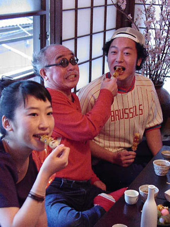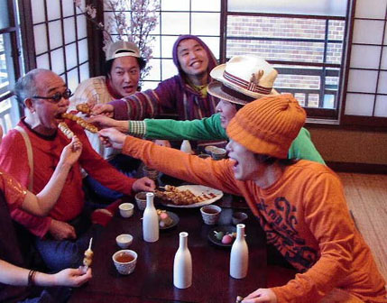 ご指名で荒木さんの隣に座ったバンドの紅一点、ベースのなっちゃん。お酌やお団子食べさせてもらって荒木さんゴキゲン。「男には食べさせてもらいたくない(笑)」と言いながら、ノリノリでパーカッションの松井さんに食べさせてあげる荒木さん。しまいには、bonobos全員からお団子が差し出されて、荒木さんビックリ!