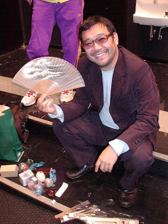 リハや取材が終わるまで待機。撮影スタッフが用意した日本みやげの風鈴や扇子の中から、波の絵の扇子を発見!ディレクター箭内さんとカメラマン平間さんが「サーフィンだけに、WAVEでいきましょう」と小道具としてキープ(笑)。平間さんは前の仕事の関係で、めずらしくスーツ…!