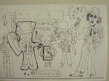 撮影が決まったのはこの2つのコンテ。お二人とも絵心があります!竹中さんは“手がサボテンの男がよく見たら小さなイカを投げている”案 (写真㈬)。永積さんは“商店街でバンドのサイン会” 案(写真㈭)。イメージの共演者に安さん、塚地さん、池田さんを熱望!残念ながら忌野清志郎さんはスケジュールの関係でNG。