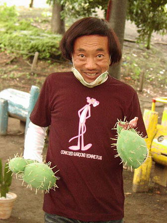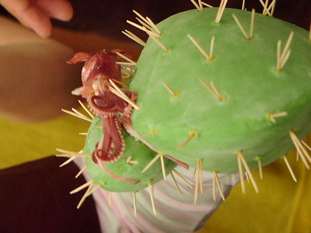 サボテン男、見参!カツラとサボテングローブを着用で「イカを愛でる感じ」を撮影。「わ~、イカだぁ」「イカかよっ!」と役に入り込む竹中さん。イカは程よい大きさの“ボイルやりいか”。