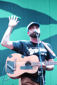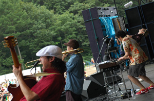 今回のフジロックで、見逃せないアーティストNo.1候補として自分が挙げていたのがこのケーク。本国アメリカでは絶大な支持を得ているんだけど、日本での知名度がイマイチなためか、来日ライヴは実に8年ぶりになるという。CDを聴いて、キャレキシコ辺りに近いかな?なんて思っていたけど、向こうがマリアッチの伝統を汲む音楽だとしたらこちらは完全に自分解釈のミクスチャー。ゴミ捨て場に落ちてそうなボロボロのアコギ(ピックアップはガムテープで装着!)に歪み系のエフェクトをガンガンにかけ、キーボードとトランペットとピアニカのフレーズをサンプリング的に挿入する。オルタナを通過しつつも強烈に〈乾いた〉サウンドが醸す無国籍っぷりはクール過ぎ! 中盤から雨が本降りになってきたにも関わらず、“Daria”のサビ部分を合唱する声がグリーンに響き渡っておりました。次はぜひ単独で来日を。ちなみに、フロントマン、ジョン・マクレアの徹底的に垢抜けないルックス(髭にサングラスにキャップ)もこのバンドの魅力なんだということを確認した次第であります。(*ヤング係長)