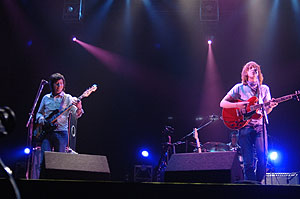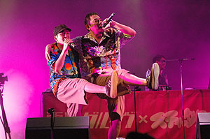 “ナンバーズ”で幕を開け、大合唱が起こった続く“聖☆おじさん”で彼らは会場を完全にもっていった。ヒロシをもじったアニのネタ見せコーナーや、瀧とアニの血みどろのMCバトル、七尾旅人をコーラスに迎えた“英数/かな”“機材屋ロックンロール”など、見せ場もキッチリと用意して飽きさせない。DJブースではラップトップを操作しながら歌いまくる卓球の姿が。ラストは“Love Love Session”、サンバ風にリアレンジされた“Twilight”が祭りを盛り上げて大団円。ステージ上に渦巻く何かおかしなヴァイブがフロアに伝播したかのようなライブだった。*内田