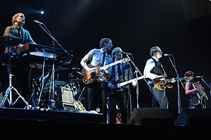 ナイン・インチ・ネイルズ、イアン・ブラウン、Qティップ、そしてこのデュランデュランと、見事に客層が別れた13日の最終公演。したがって、熱心なデュラン・ファンが会場に集結。バンドもその期待に応えるように、オープニングは新曲“(Reach For The)Sunrise”で挨拶しながらも、2曲目でいきなり“Hungry Like A Wolf”をプレイ! そりゃ、盛り上がるって。そこからは“Planet Earth”“Save A Prayer”“Notorious”など、ファン感涙の名曲を次々と披露。黒人女性のコーラス・シンガーやサックス奏者を従えて、ショウアップされた演出に会場はお祭り騒ぎに。プレスリー化したサイモンをはじめ、メンバーのオヤジ姿も彼方に吹っ飛ぶ活躍ぶりで、スーパースターの復活を印象づけた。*村尾