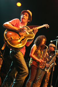 堂々bounce10月号の表紙を飾り、野心的なニュー・アルバム『ACALANTO』発売直後の期待度120パーセントのステージ。とはいえのっけから代表曲“It's too late”の豪快なカヴァー、そしてビールを片手に「乾杯!」のかけ声(?)でいつものSaigenjiのりに場内を引き込んでしまった。新曲を交えぽんぽんと繰り出される構成、そのパワフルな演奏から勢いに任せているように感じられる彼のステージングだが、バンドとのグルーヴ感の駆け引きには相当高い基準があるに違いない。常にアウト・オブ・コントロールな魅力をたたえた奇才に大きな拍手を!