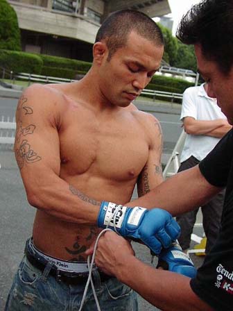 着替えた矢沢さんとKIDさんが再び登場。矢沢さんは白のレザージャケットとジーンズに。KIDさんは自身が手がけるブランド「HARD HIT」のTシャツを脱いで、試合のときのように上半身裸になってグローヴを装着!