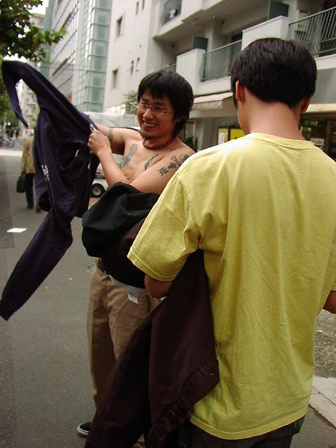 横山さん、路上で生着替え!?「PIZZA OF DEATH」シャツの社長限定デザインらしいっす。撮影でROCK IN JAPAN FES.に行ったカメラマン平間さんと、今年の夏フェス話なども。