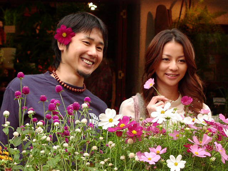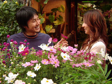 花屋前での撮影。横山さんは花を髪につけたり、口にくわえたり、次々とおもしろポーズを!「花をお互いに渡してください」という撮影指示にも、なぜかめちゃめちゃ笑顔!それを見た香里奈さんも大笑い。