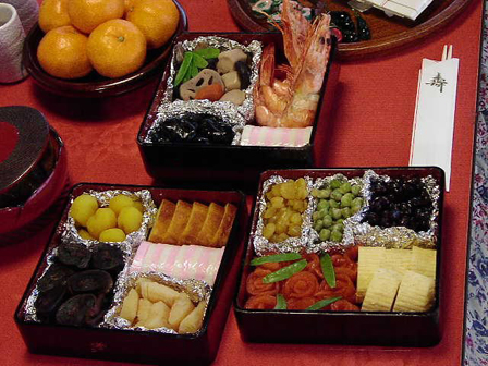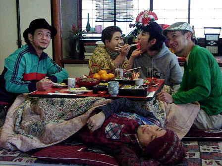 コタツでおせちを食べるシーンの撮影。まるでコタツで和むPOMERANIANSの面々が、おばちゃんの手料理を食べているよう?手前で寝ポジションの勇気くん、おせちが食べられなくて悲しそう。