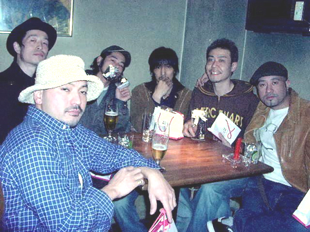 満員になったバーで、しばし飲みながら語る皆さん。SLY MONGOOSEアルバム『TIP OF THE TONGUE STATE』には、リリーさんがコメントを寄せていたり、すでに交流がある両バンド。もう立ち飲みや状態で、撮影前のウォーミングアップもいい感じです。
