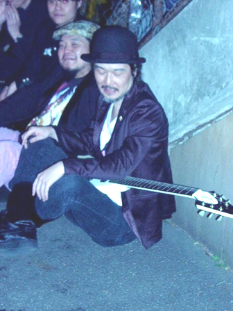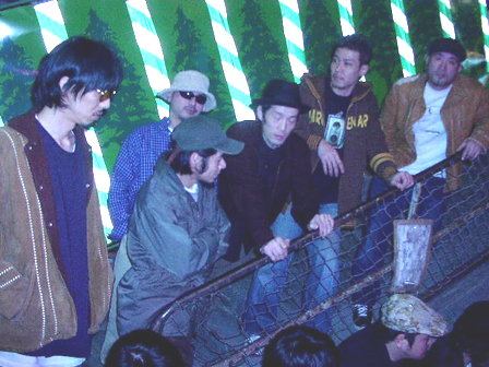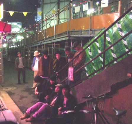 工事現場わきの階段にて撮影スタート。SLY MONGOOSEチームは階段に登り、東京ムードパンクスチームは地面に座って・・・。