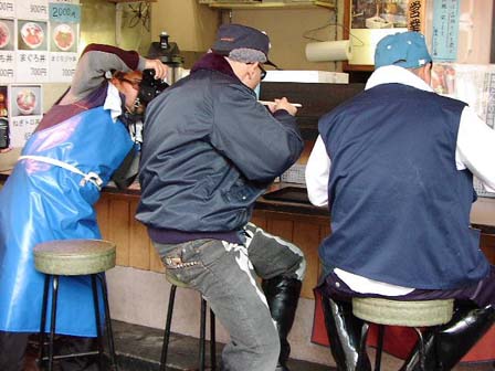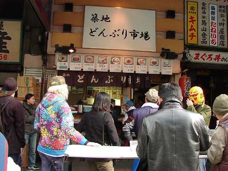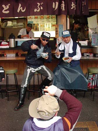 まずは、丼ぶり屋さんのスタンドで撮影スタート。市場の人たちではありません。すっかり周りに馴染んでますが、撮影中です(笑)。